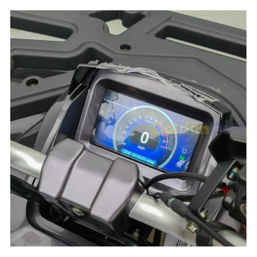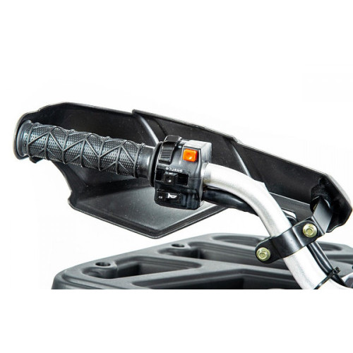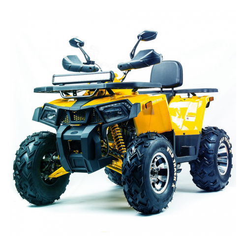 Трансмиссия и ходовая часть квадроцикла представлена прочными разноразмерными шинами, металлическими литыми колесными дисками, автоматической трансмиссией с реверсом. Модель имеет крупный размер, удобное посадочное место, высокий дорожный просвет (320 мм) и чувствительную тормозную систему. В комплекте идет система автозапуска с дистанционным контролем, которая позволяет завести, заглушить квадроцикл на расстоянии 100 метров. А так же имеется ограничитель скорости, расположенный с правой стороны руля. Стоит принять во внимание и наличие таких опций как: защита рук, удобная широкая и закрытая площадка для ног, расширители колесных арок, передний отбойник, гнездо прикуривателя, спидометр, передние и задние поворотники.