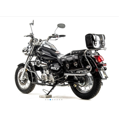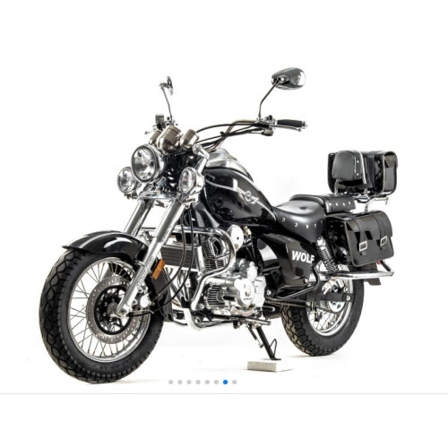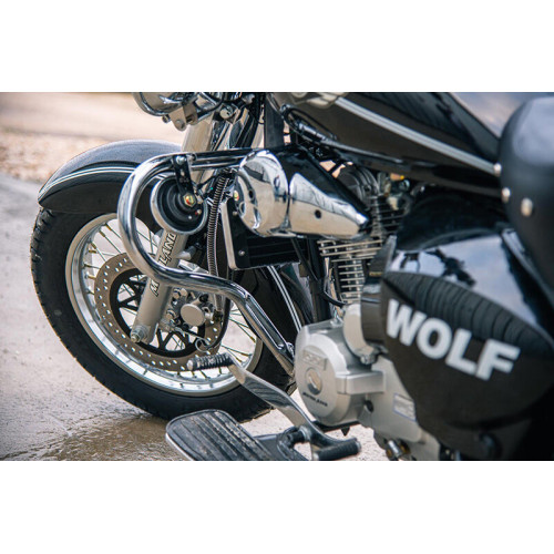 Дорожный мотоцикл MOTOLAND WOLF 250 сразу привлекает внимание своим внешним видом. Выполнен в винтажно-классическом стиле с удлинённой рамой и передней вилкой, обилием хромированных элементов. Солидный, матово-чёрного цвета — этот чоппер выглядит значительно лучше своей ценовой категории. Мощный движок и крутейшие технические характеристики также отличают его от собратьев. Этот байк просто создан для езды по городским джунглям!